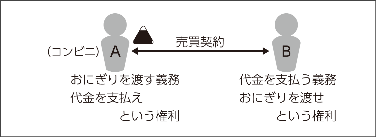 ⬇ たとえばBがコンビニAでおにぎりを買うと(売買契約を結ぶと)、売主となったAと買主となったBには、民法に基づいて下図のような権利と義務が発生する*1。